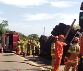 O Corpo de Bombeiros informou que foi chamado por volta das 8h para atender ao tombamento de uma carreta, que saiu da pista em uma curva perto do Haras Sapecado.