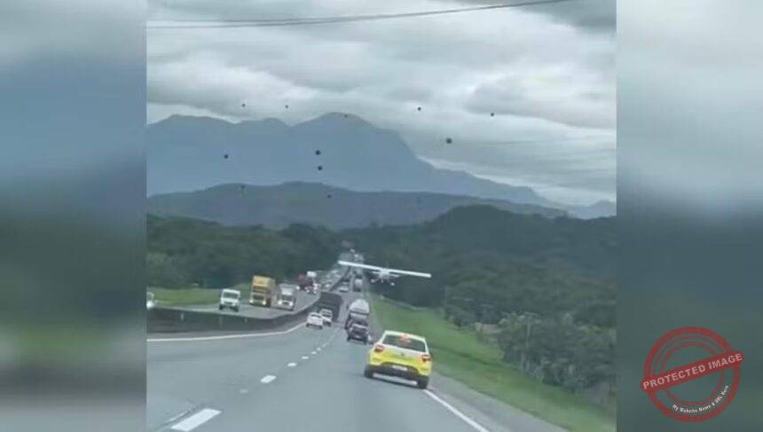 Vídeo feito por ocupantes de um veículo mostra o avião de pequeno porte pousando em meio a carros e caminhões. Ele não colidiu com nenhum veículo.